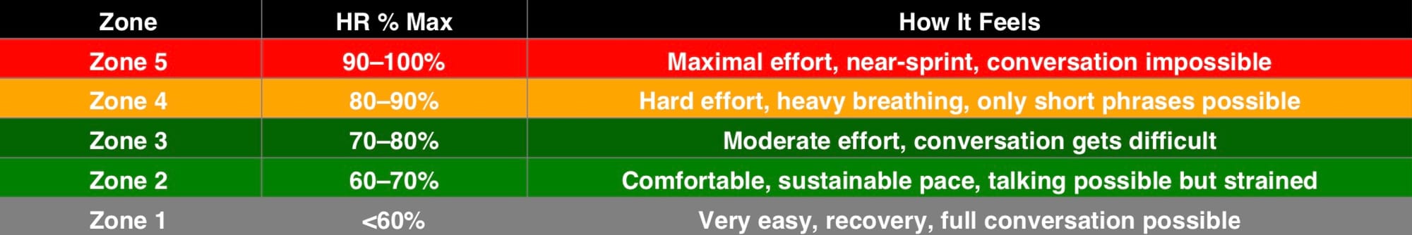 Note: Training zones aren’t universal. Different systems define them slightly differently, but the purpose is the same: to align your effort with the intended goal of the workout. What matters most is consistency — using the same framework to measure, track, and adjust your training over time.