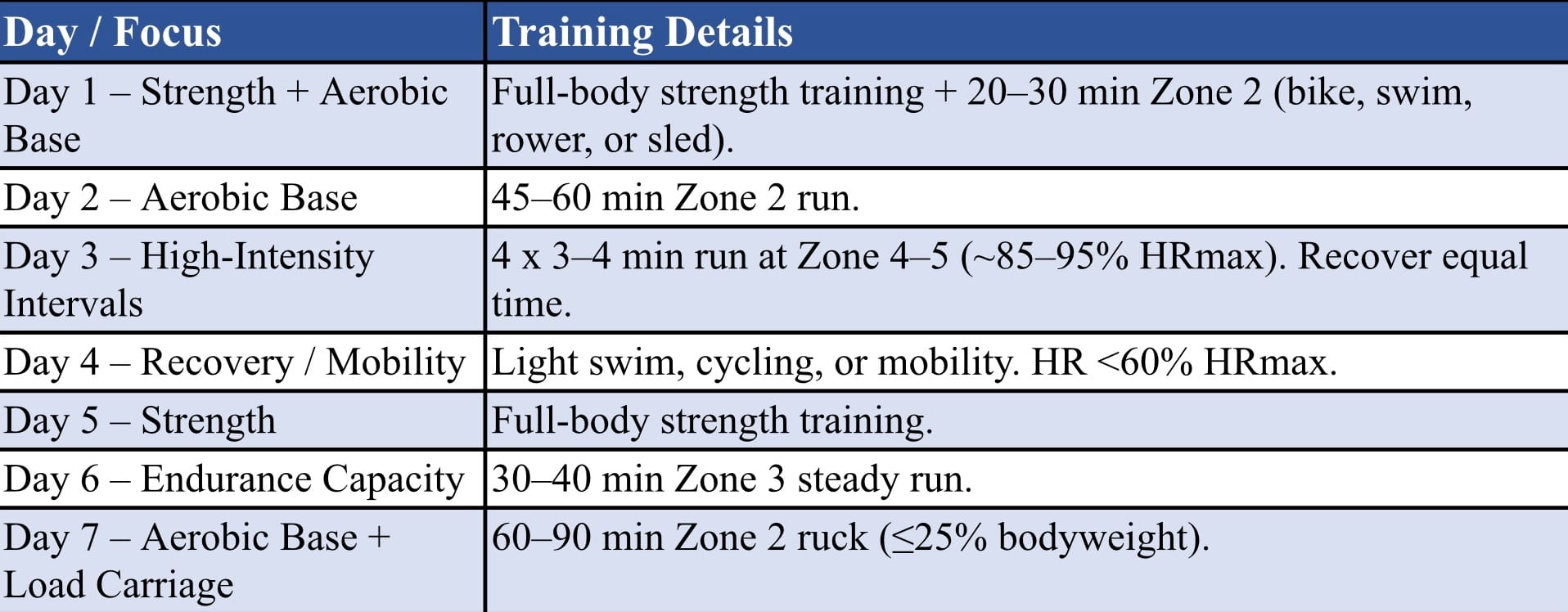 A VO₂ max–focused week for a tactical athlete should balance aerobic base work, high-intensity intervals, strength, and occasional load carriage—while still leaving room for recovery. Using a variety of modalities (running, rucking, cycling, rowing, swimming, etc.) reduces stress and builds versatility. Here’s one example of how that balance might look: