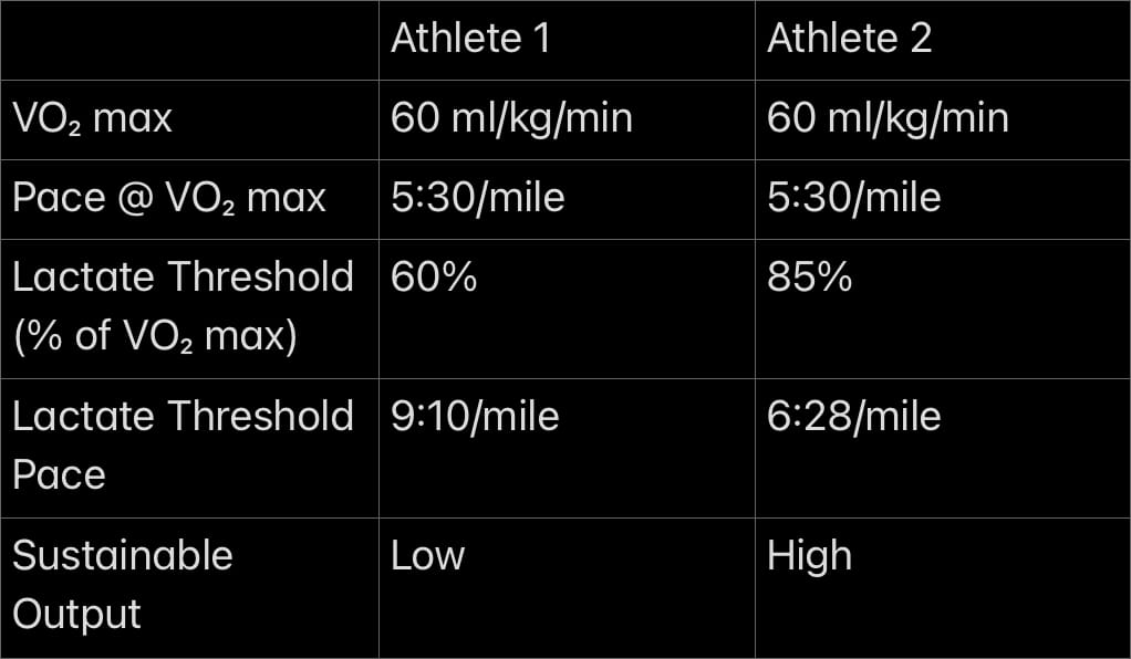 If lactate threshold is a new concept, it can be hard to appreciate how dramatically it affects performance. This side-by-side comparison helps make its impact clear. In this example, both athletes have the same VO₂ max of 60 ml/kg/min and can each run a maximal mile in 5 minutes and 30 seconds. Their engines are identical on paper.