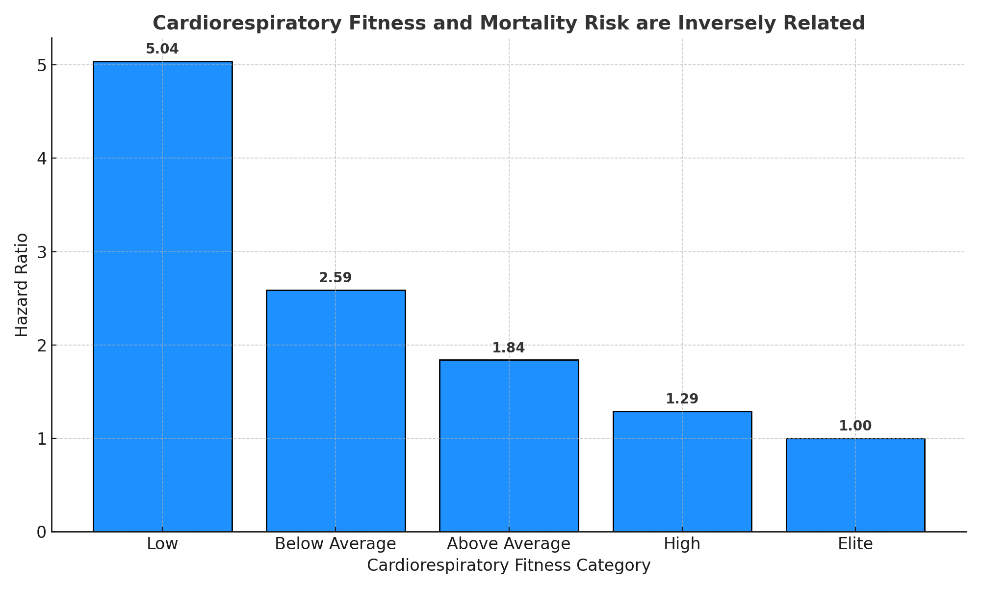 The results were striking: higher cardiorespiratory fitness was strongly tied to longer survival, with no upper limit to the benefit. Those in the lowest fitness category faced more than five times the risk of death compared to the elite group. Put differently: someone with very low fitness was over five times more likely to die during the study period than someone with elite fitness. Yet even a small improvement—from “low” to “below average”—nearly cut that risk in half.