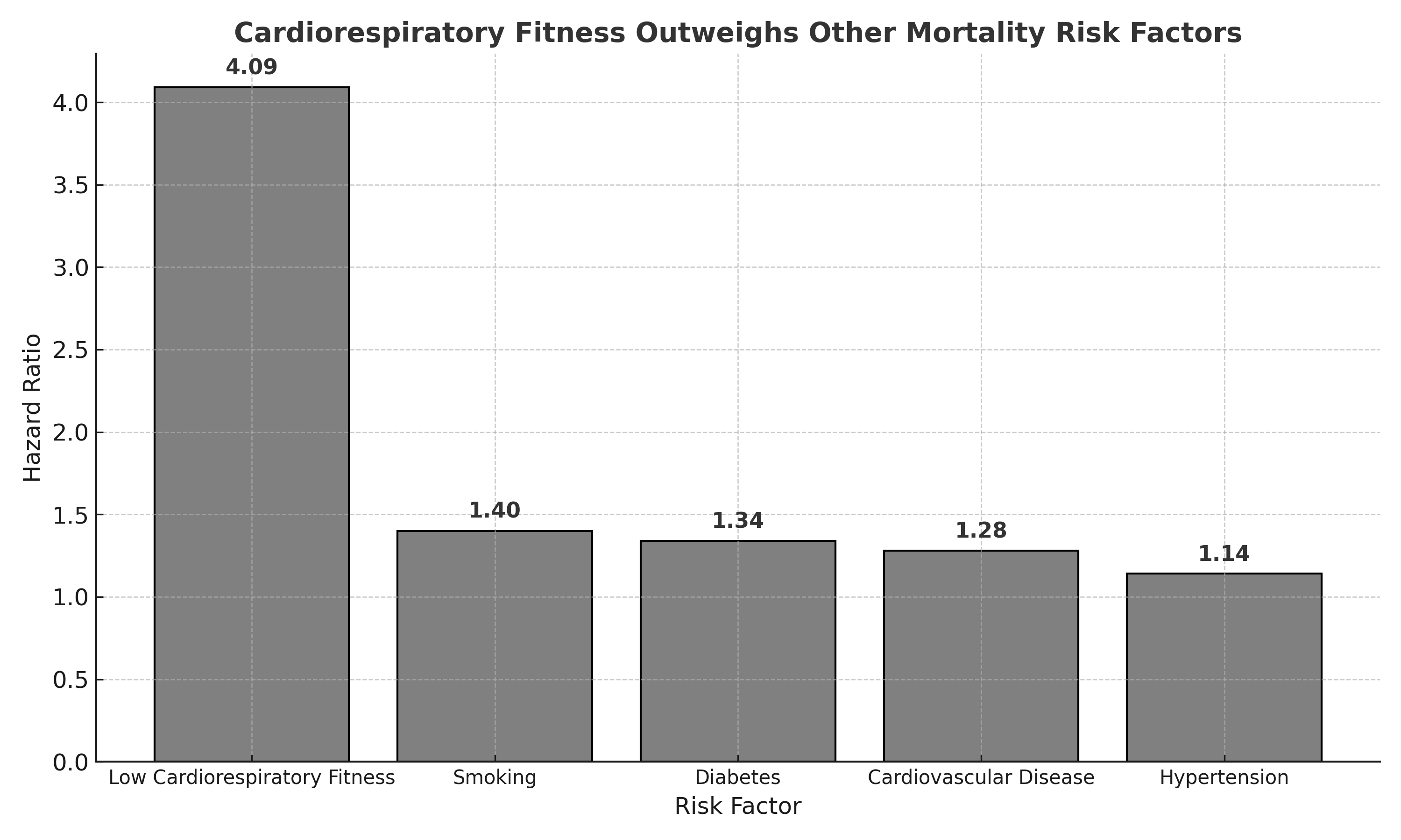 In plain terms: poor cardiorespiratory fitness carried a far greater risk of early death than smoking, diabetes, or high blood pressure. That doesn’t mean those conditions aren’t problematic—they clearly are—but it underscores that cardiorespiratory fitness is more than a performance metric. It’s a survival factor.